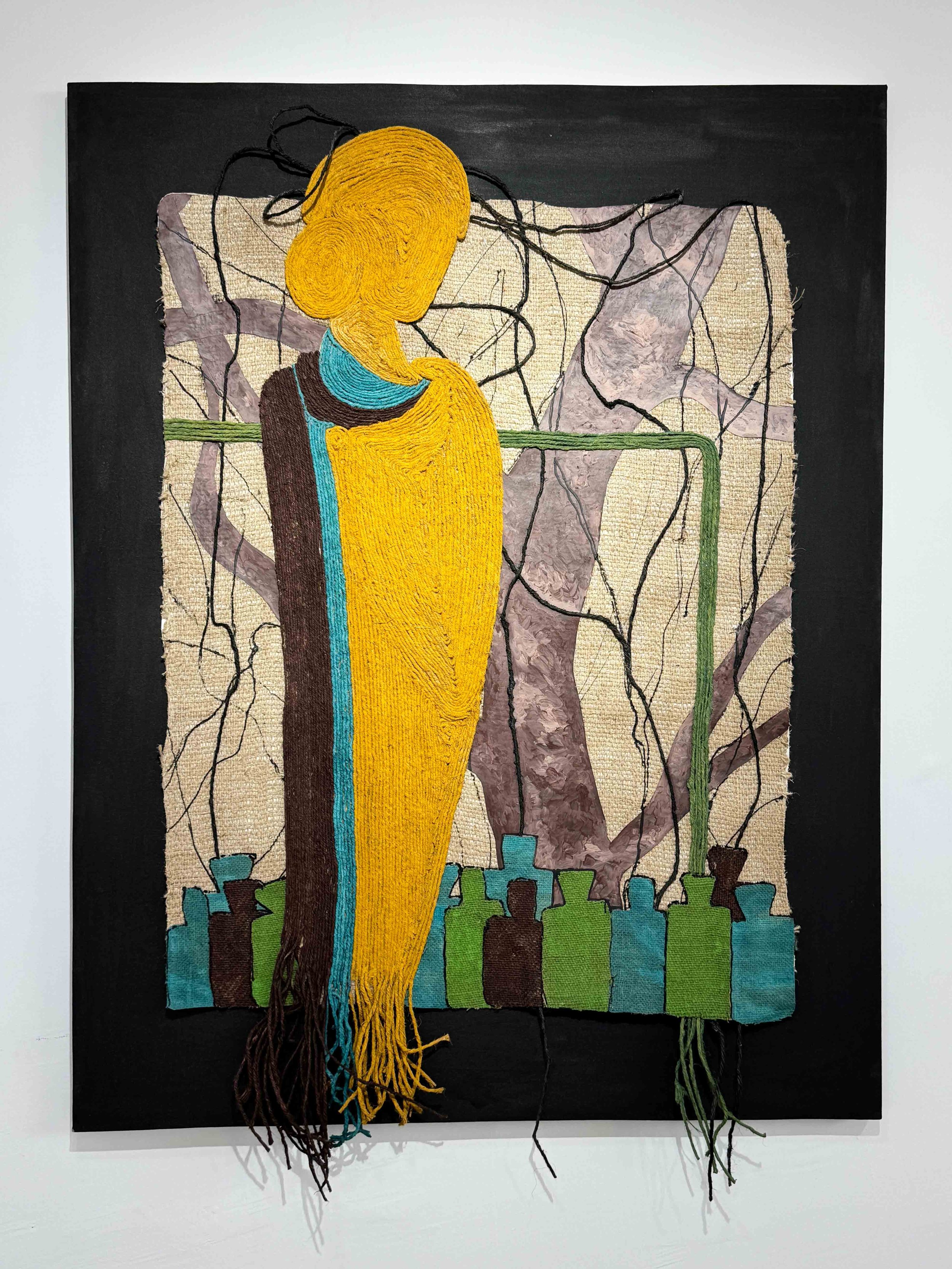 Through painting and assemblage, Tamerat transforms these elements into intricate compositions. His use of color enhances the organic textures of his materials, breathing life into their inherent stories. As his technique has evolved, so has his ability to convey the strength and presence of women, no longer just as figures but as the very structures that sustain life. By allowing the materials to shape the process, he creates pieces that feel alive—woven with the energy of past and present artisans. His compositions and textures aim to evoke the spirit of those who have labored and nurtured, offering a visual language that bridges the human and natural worlds.